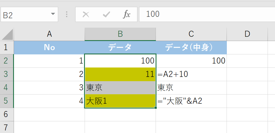 以下の表の範囲B2:B5内で、数式が入力されているセル(B3とB5)を黄色で塗りつぶします。