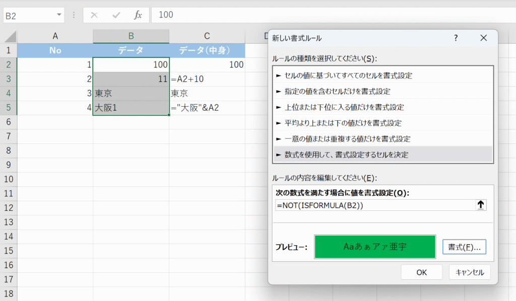 | 数式でなければ(手入力なら)TRUE | NOT(ISFORMULA(セル)) | NOT関数で結果を反転させる |
