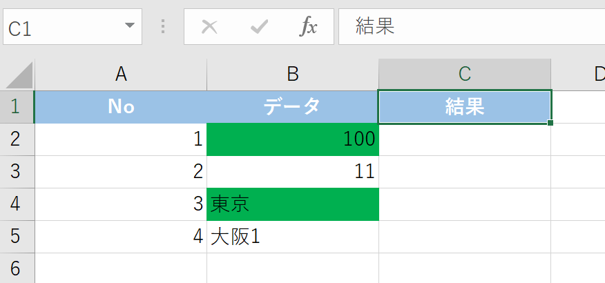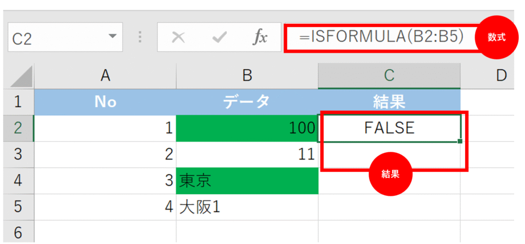 C2にはFALSEが返されましたが、これは範囲の先頭セルB2が数値(手入力)だからです。B3やB5が数式であっても、この単一の結果には反映されません。