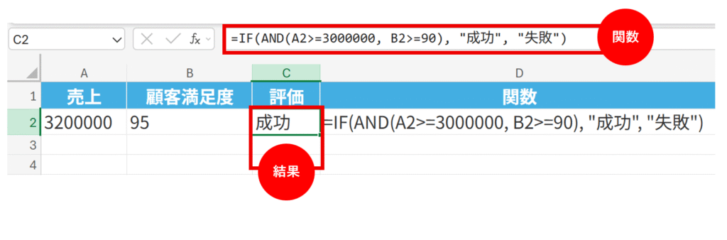 例題: 「売上が300万円以上」かつ「顧客満足度が90点以上」の場合に「成功」と表示したい。