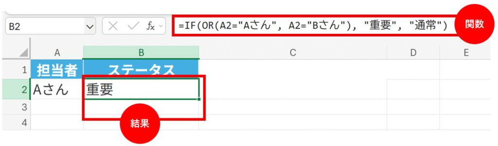 例題: 「担当者がAさん」または「担当者がBさん」の場合に「重要」と表示したい。