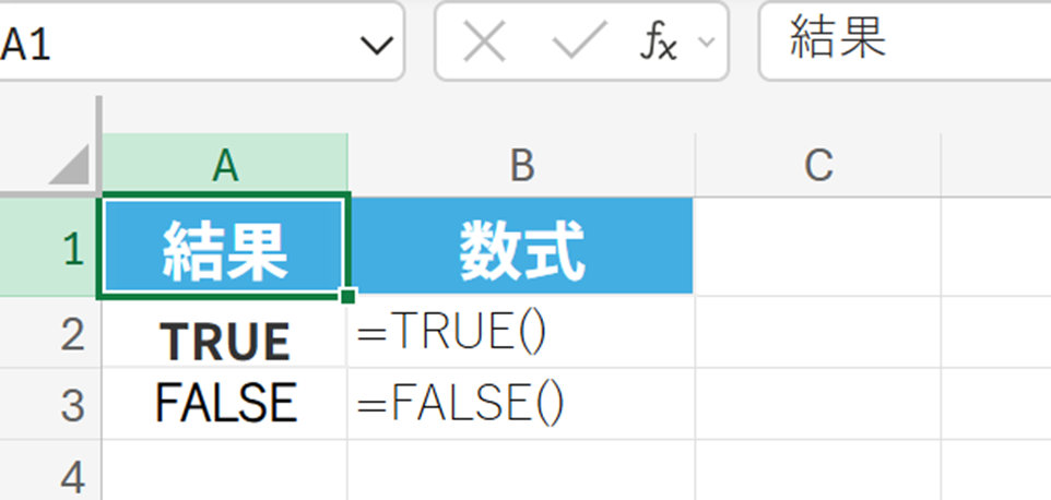 それぞれ論理値のTRUE(真)またはFALSE(偽)を返します。他の関数と組み合わせて使われることが多いです。