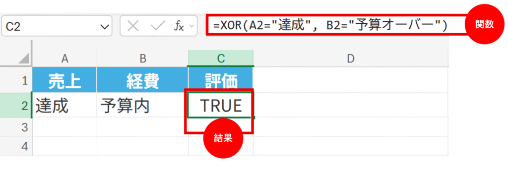 XORは排他的論理和と呼ばれ、どちらか一方だけが真の場合にTRUEを返します。両方が真、または両方が偽の場合はFALSEになります。