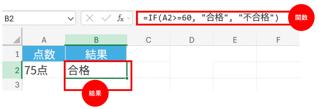 例題: 「点数が60点以上」なら「合格」、それ以外なら「不合格」と表示したい。