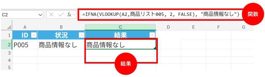 IFNA | 式の評価で#N/Aエラーが発生した場合に、指定した値を返します。 | =IFNA(値, #N/Aエラーの場合の値) | |