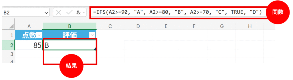 例題: 「点数が90点以上」なら「A」、「80点以上」なら「B」、「70点以上」なら「C」、それ以外は「D」と表示したい。