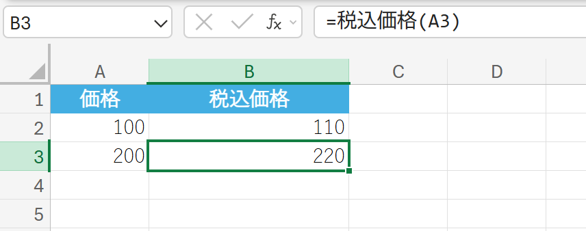例題: 消費税込みの金額を計算するカスタム関数を作成し、それを「税込価格」という名前に定義したい。