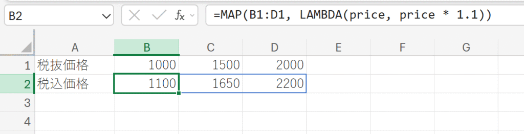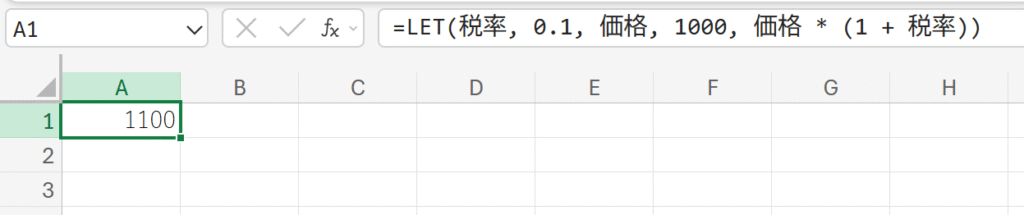 =LET(税率, 0.1, 価格, 1000, 価格 * (1 + 税率))