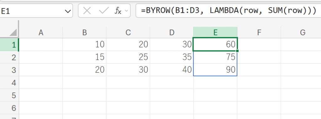 BYROW | 配列を行ごとに論理式でスキャンし、結果の配列を返します。 | =BYROW(配列, LAMBDA(行, 論理式)) | |