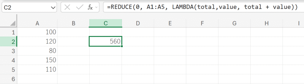数式:=REDUCE(0, A1:A5, LAMBDA(total, value, total + value))