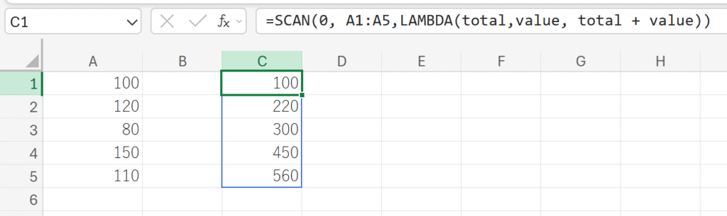 数式:=SCAN(0, A1:A5,LAMBDA(total, value, total + value))