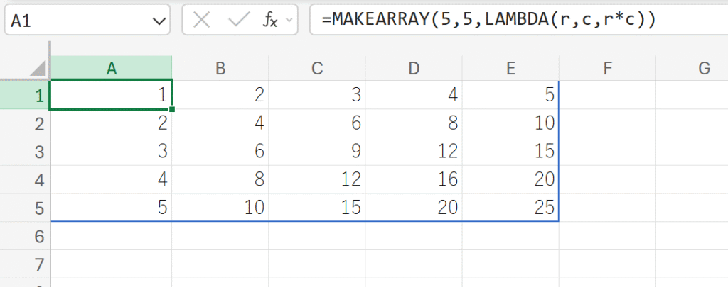 数式:=MAKEARRAY(5, 5, LAMBDA(r, c, r * c))