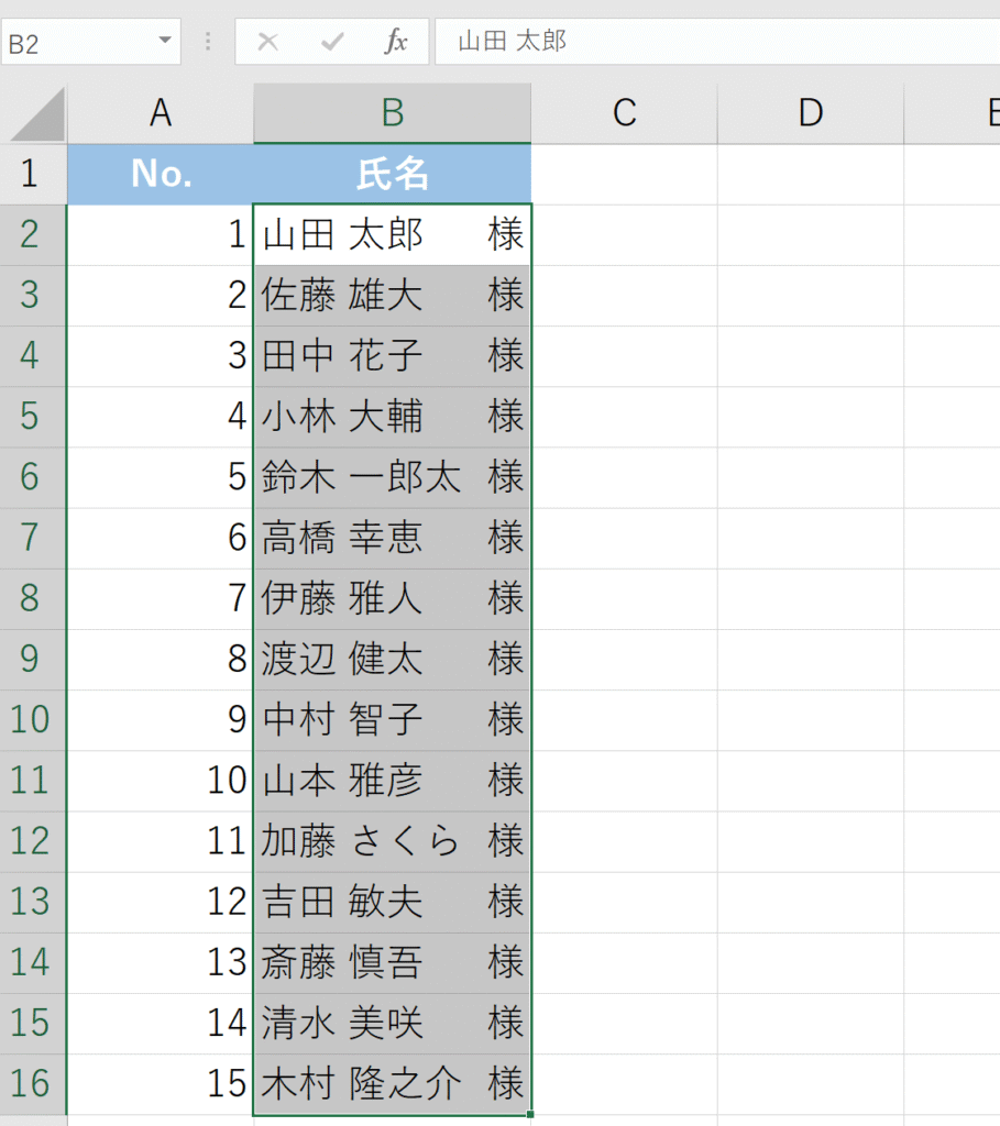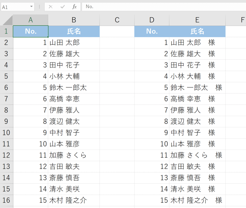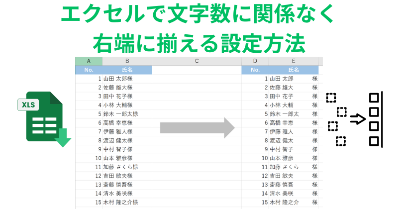 設定が完了すると、名前の文字数に関係なく、「様」がセルの右端に揃って表示されます。