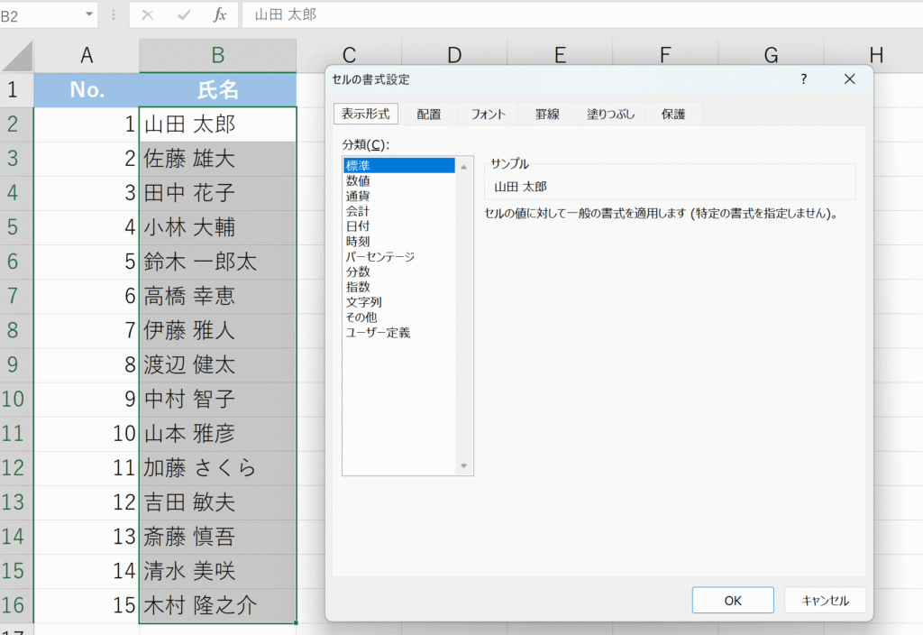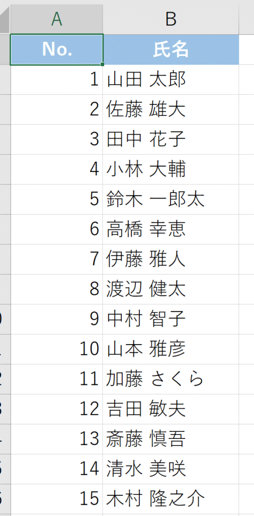 下記氏名一覧を例に編集します。
