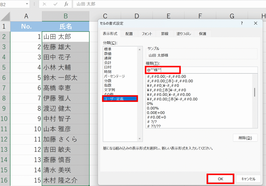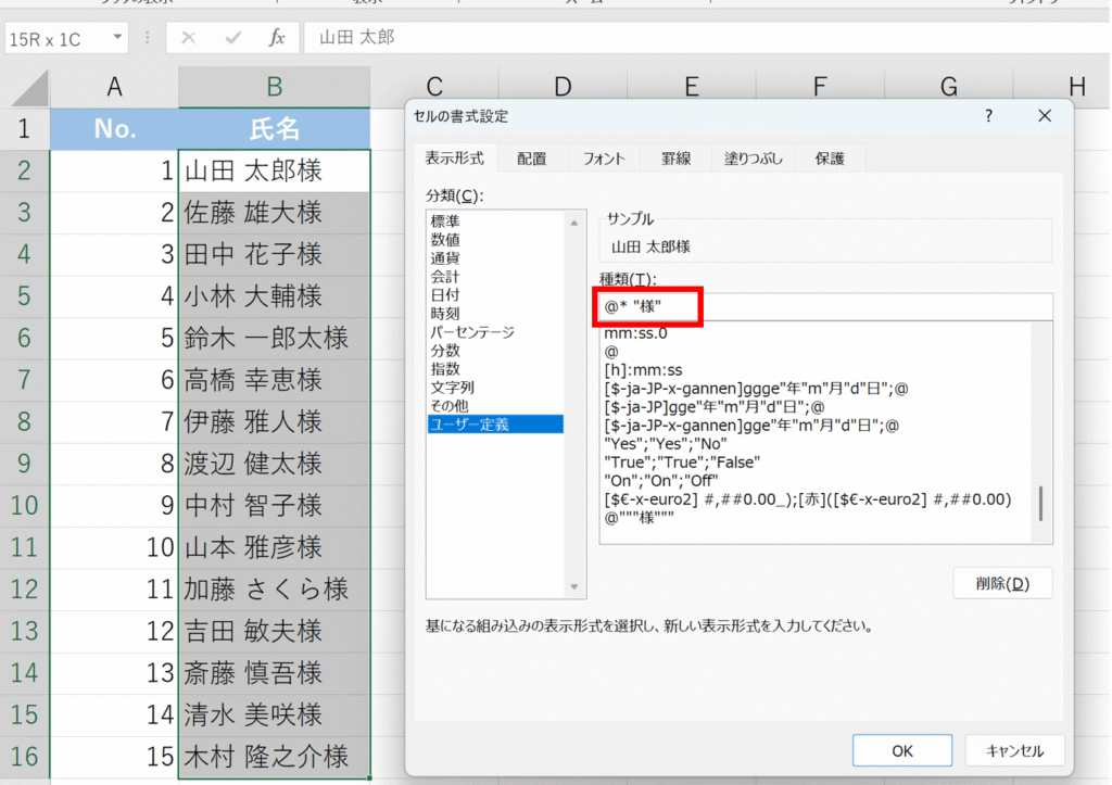 ユーザー定義で「@””様””」を設定する