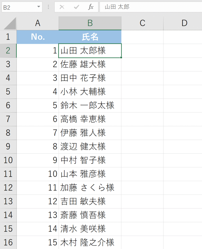 セルに「山田」と入力すれば、見た目は「山田 様」になります。しかし、そのセルを選択して数式バーを見ると、表示されているのは「山田」のみです。