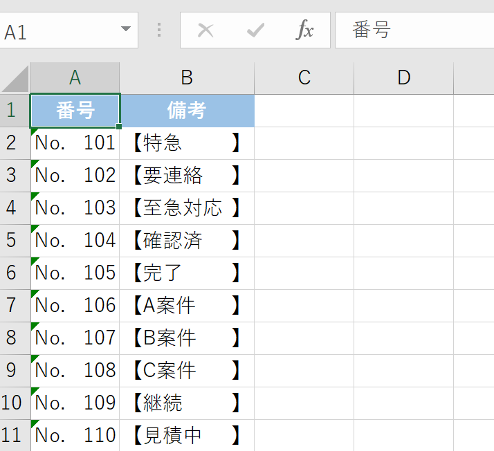 | 備考の前に「【】」で揃える | “【”* @* “】” |