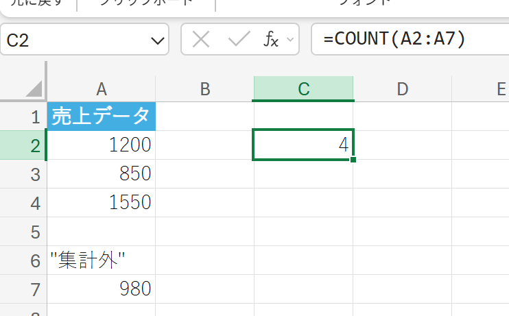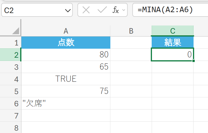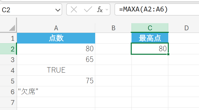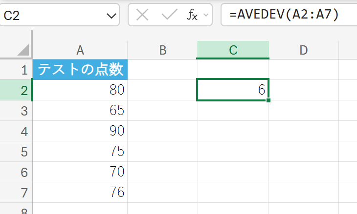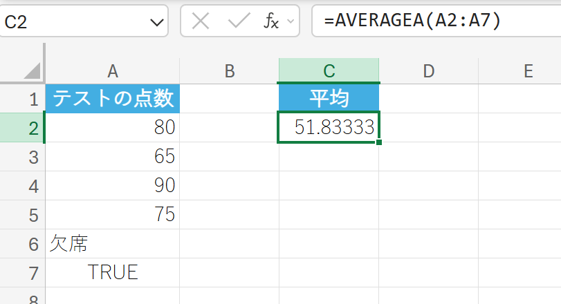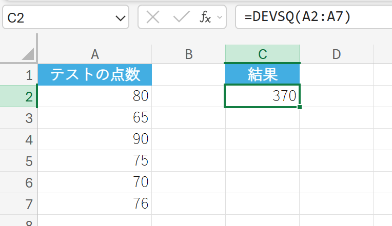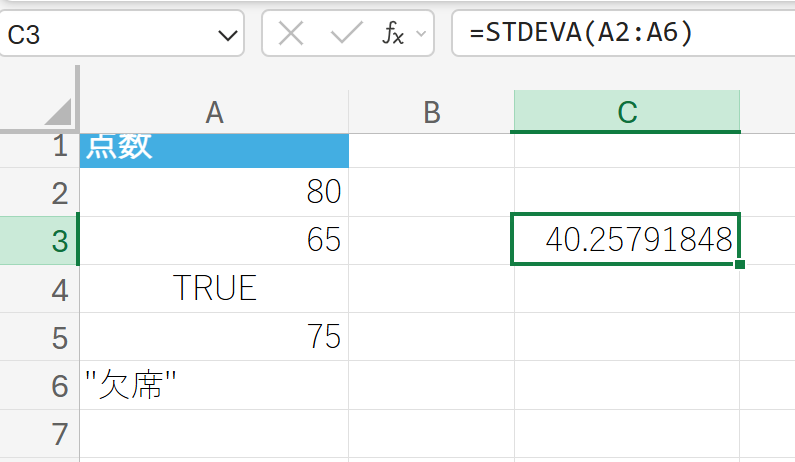 テストの点数データに論理値や文字列を含めて標本の分散を求めます。