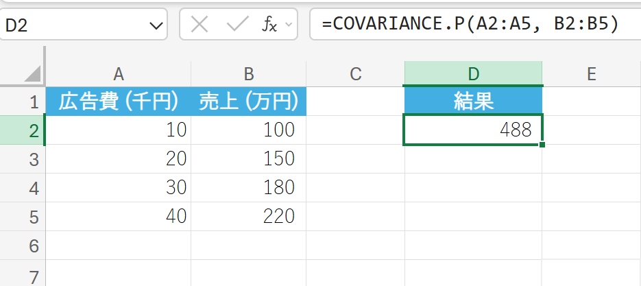 - 値1, [値2], …:分散を計算したい 1〜255 個の引数、または配列やセル範囲を指定します。