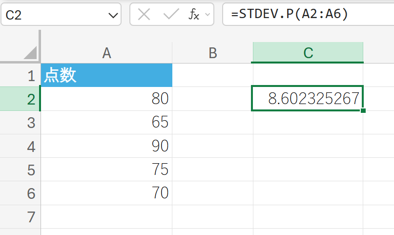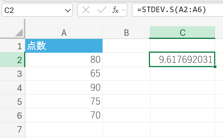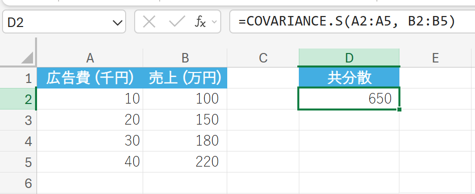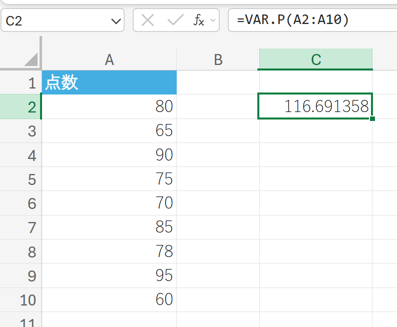 データが母集団の標本であると仮定して分散を計算します。一般的に、手元のデータが母集団の一部である場合、こちらを使用します。VAR 関数と同じ機能です。