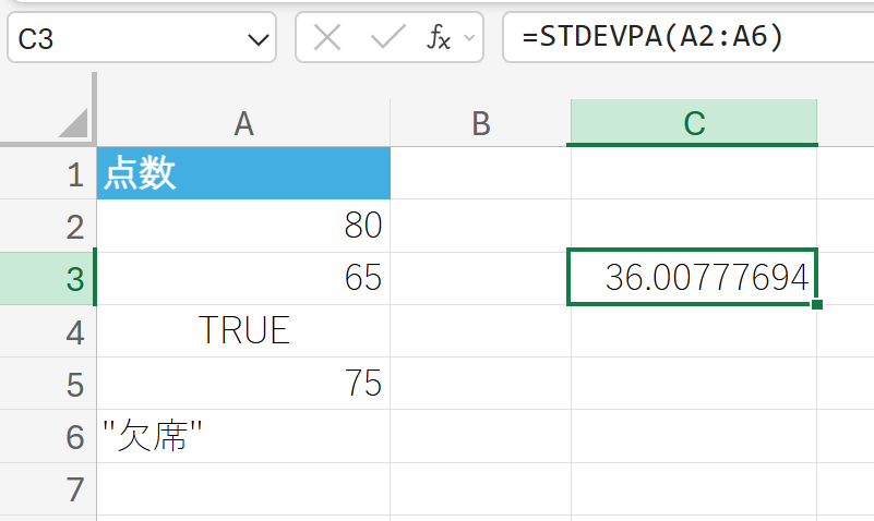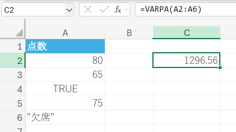 VARPA 関数は、母集団の分散を返しますが、論理値や文字列も評価の対象とします。
