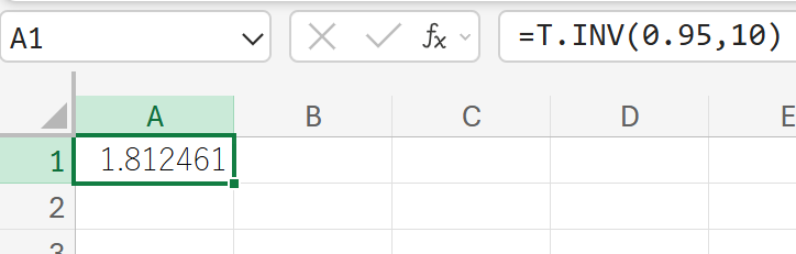 自由度 10 の t 分布において、累積確率が 95% となる t 値を求めます。