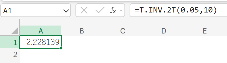 T.INV.2T 関数は、スチューデントの t 分布の両側確率の逆関数値を返します。