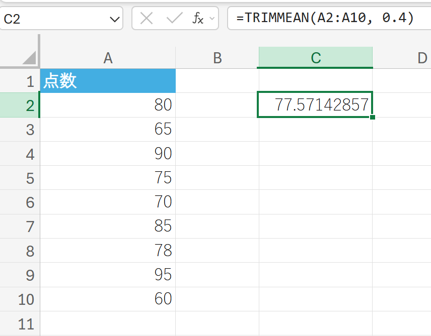 TRIMMEAN 関数は、データ セットの P パーセントを除外した平均(刈り込み平均)を返します。
