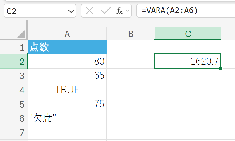 VARA 関数は、標本の分散を返しますが、論理値や文字列も評価の対象とします。