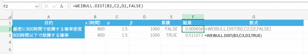 - 形状パラメーター (α): 1.5 (α>1 のため、時間経過とともに故障率が増加する摩耗型)