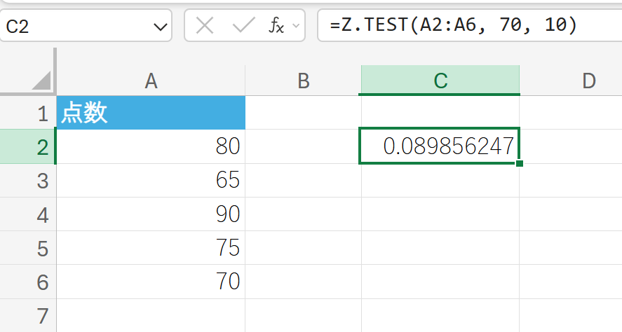 Z.TEST 関数は、片側 Z 検定の P 値を返します。