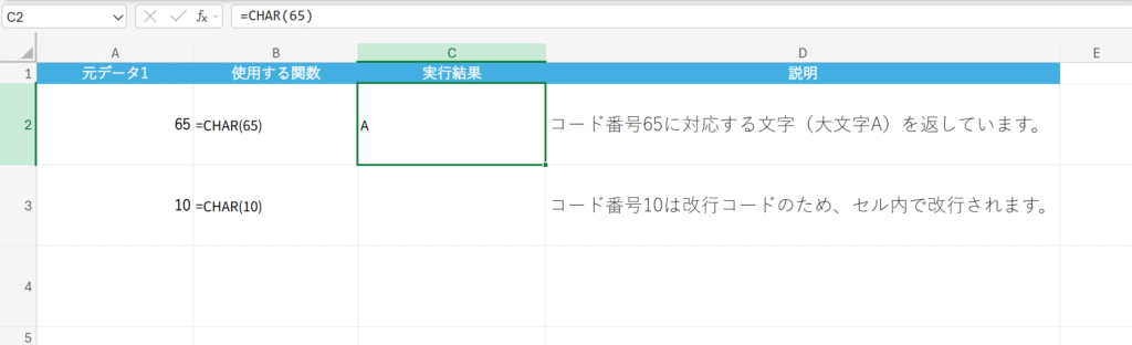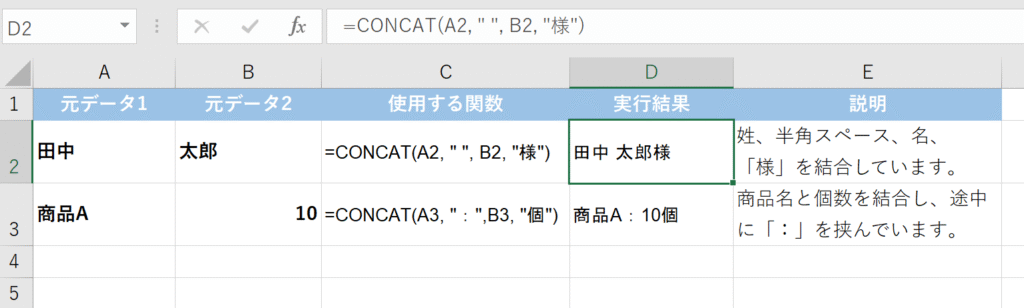 - 文字列1, 文字列2…: 連結したいセル、文字列(ダブルクォーテーションで囲む)、または数式を指定します。