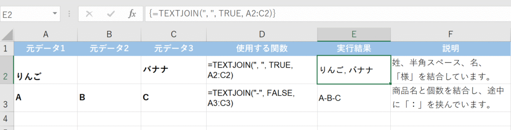 なら空白セルも含めて連結します。 - 結合する文字列1…: 結合したいセル範囲や文字列を指定します。