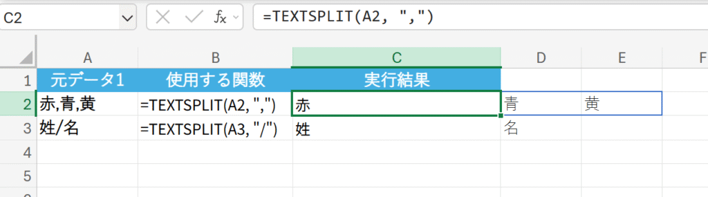 TEXTSPLIT(文字列, 列の区切り記号, [行の区切り記号], …)