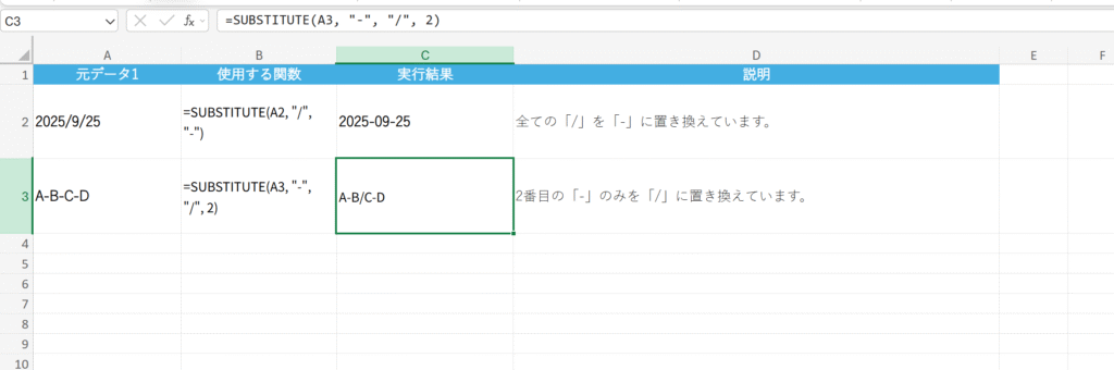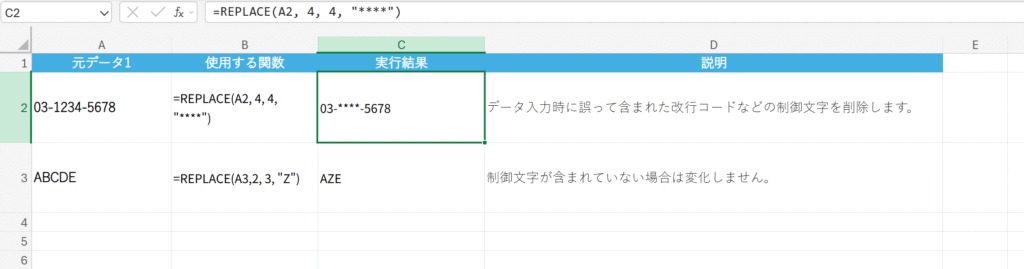 文字列の見た目を整えたり、特定の文字を置き換えたりする、データクレンジングに必須の関数です。