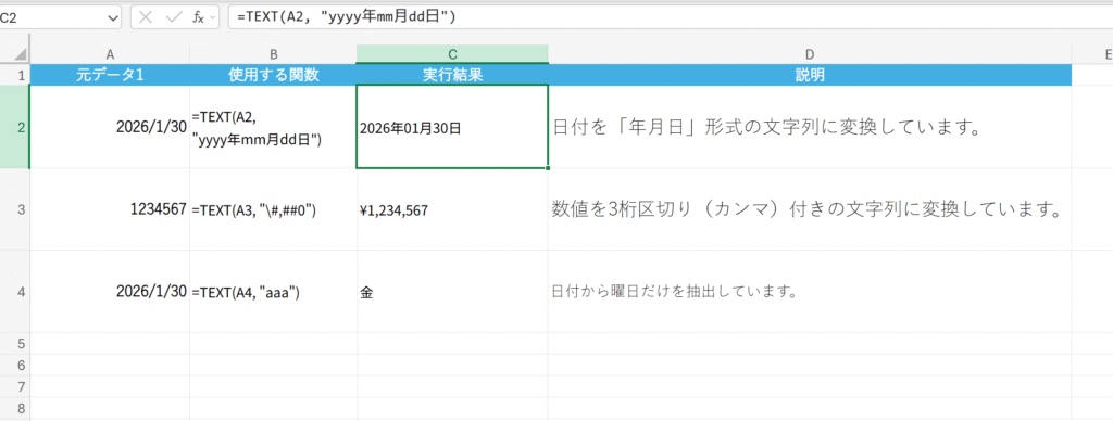 数値を「日付」や「通貨」などの文字列形式に変換して表示する、など。