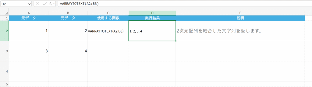 - 配列: 文字列に変換したいセル範囲や配列を指定します。