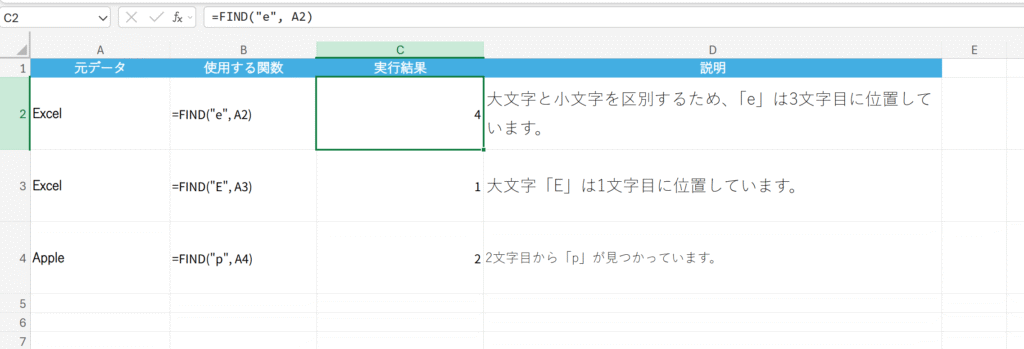 概要 文字列の中で、指定した文字列が最初に現れる位置を返します。大文字と小文字を区別しません。見つからない場合はエラー(#VALUE!)を返します。