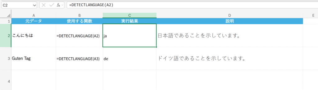 概要 文字列がどの言語で書かれているか言語コード(例: ja=日本語、en=英語)を検出して返します。(Office 365の新関数)
