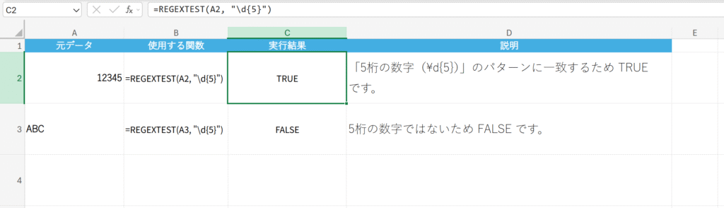 概要 文字列が指定した正規表現パターンに一致するかどうかを検証します。結果は TRUE(一致)または FALSE(不一致)で返されます。(Office 365の新関数)