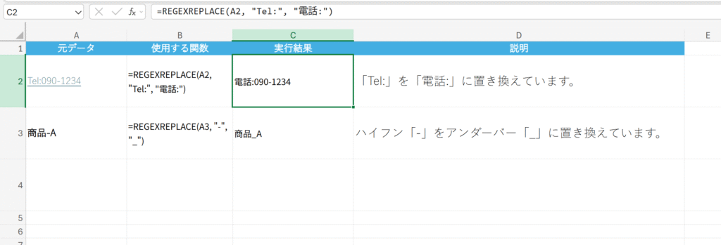 概要 文字列の中から、指定した正規表現パターンに一致する部分を別の文字列に置き換えます。(Office 365の新関数)