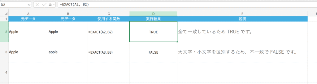 概要 二つの文字列が完全に一致するかどうかを比較します。大文字・小文字も区別します。結果は TRUE(一致)または FALSE(不一致)で返されます。