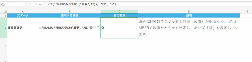 例えば、IF関数とSEARCH関数を組み合わせることで、「A列の文字列に『重要』という文字が含まれていたら『◎』、含まれていなかったら『-』を表示する」といった条件付きの処理が可能になります。