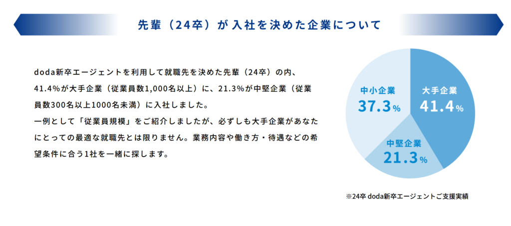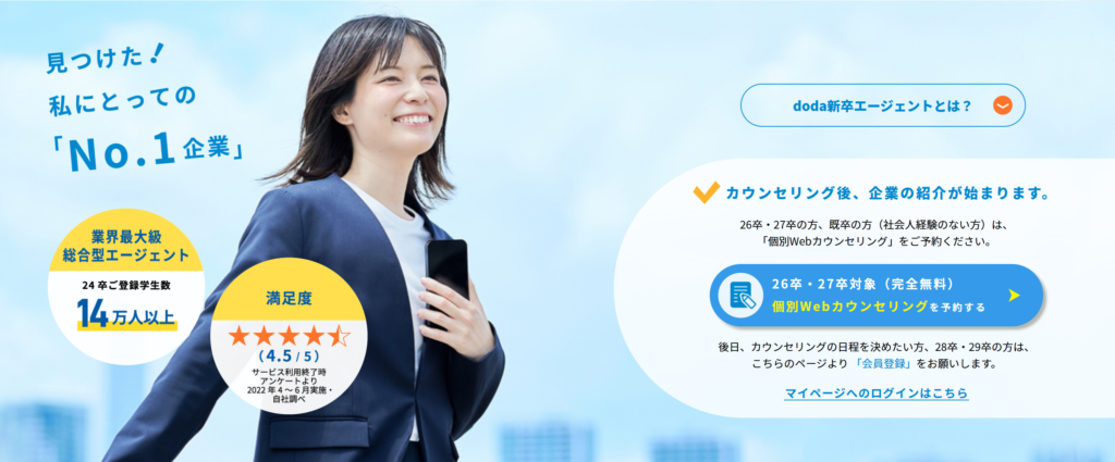 doda新卒エージェントは、24卒登録学生のみで14万人以上の学生が利用する、国内最大級の新卒向け就職エージェントサービスです。