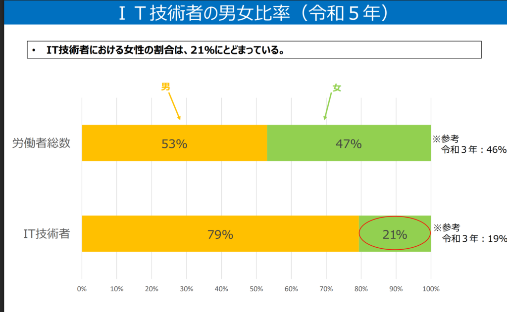 厚生労働省や総務省の調査、また「IT人材白書」などのデータによると、IT業界全体における女性比率は約20%〜25%前後で推移しています。