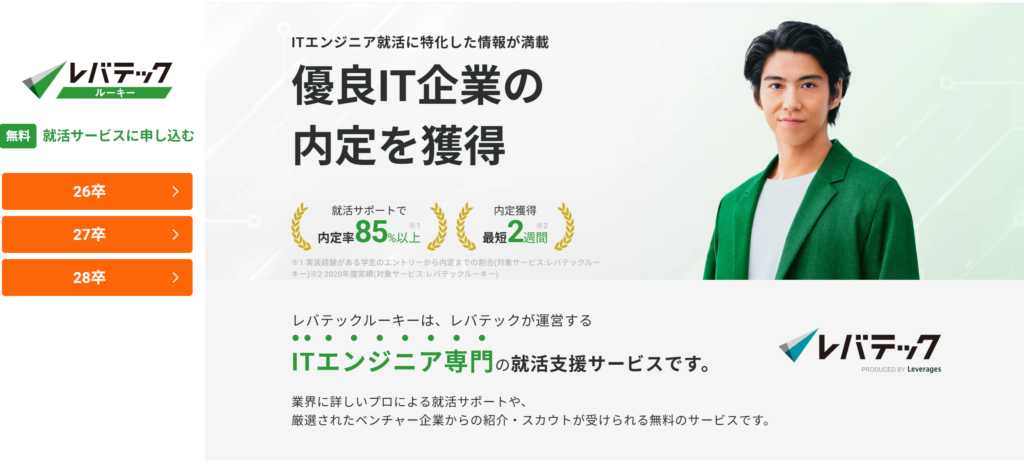 レバテックルーキーは、ITエンジニア就職に特化したスピード採用も可能な新卒学生向けの就活エージェントです。
