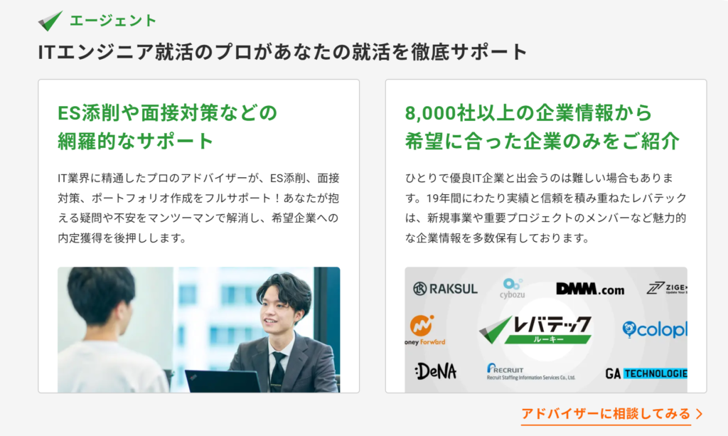 レバテックルーキーは、IT業界に特化した専門性の高いアドバイザーからの手厚いサポートが受けられる就活エージェントです。