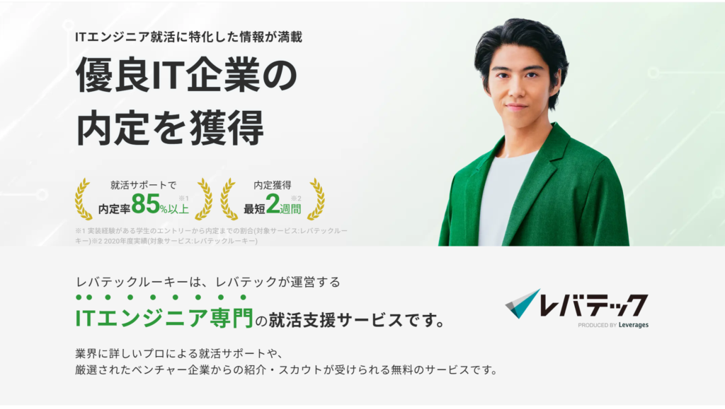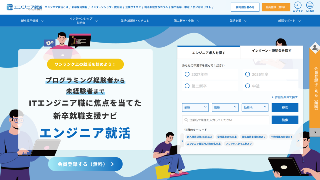 | 特徴 | ・プログラミング未経験からでも「最速で」エンジニア正社員を目指せる ・待つだけで優良企業から声がかかる「スカウト機能」で、選択肢が広がる ・内定率85%超!IT専任アドバイザーによる「人事視点」のES添削・面接対策 ・Web系・自社開発企業の求人が豊富で、モダンな環境に出会いやすい ・IT就活に特化したイベント・セミナーで、リアルな業界トレンドを即座にキャッチできる |