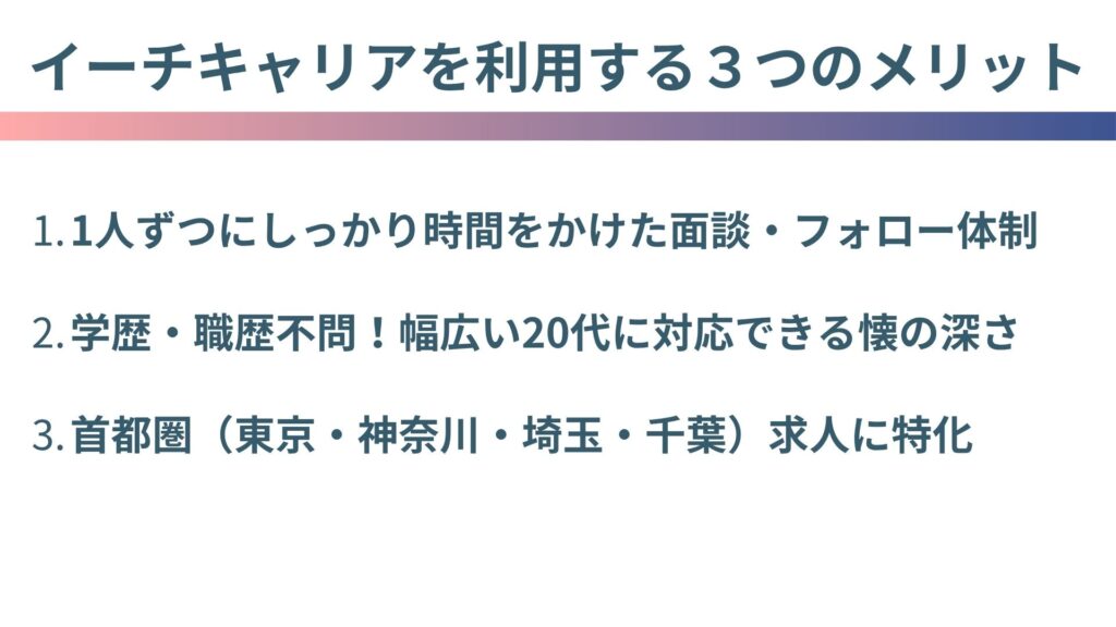 イーチキャリアは、ターゲットを「20代」と「首都圏」に絞り込み、さらに「未経験からの安定就職」に特化している点が特徴です。