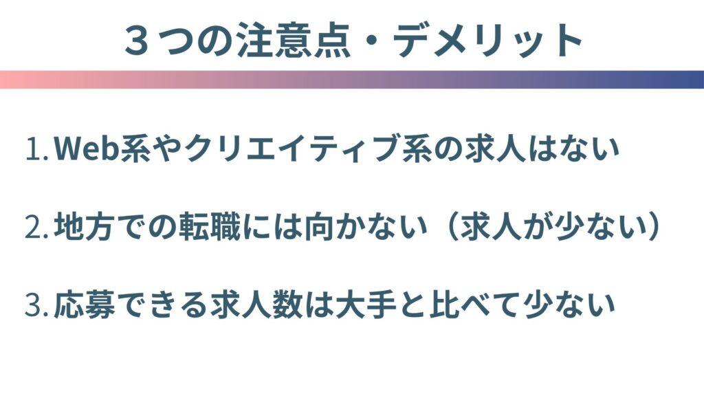 少数精鋭で丁寧なサポートを提供しているがゆえに、大手エージェントと比較すると、紹介される求人の「数」自体は少なく感じる可能性があります。
